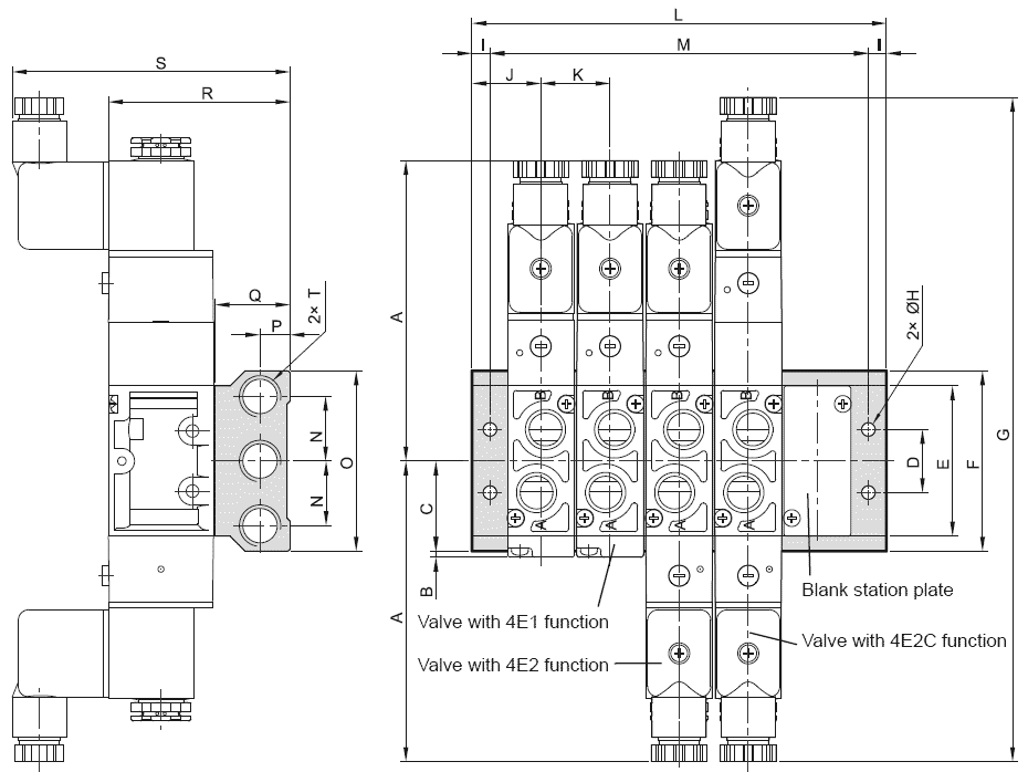 Dimensions of manifold assembly of valves series MVSE